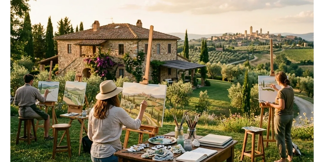 The Artist Package is a fully immersive creative retreat designed for those who want to deepen their artistic journey while experiencing the beauty of Italy. Set in the peaceful surroundings of Casale dell’Amicizia, this package invites artists to paint, explore, and grow in an inspiring environment shaped by culture, landscape, and mentorship.